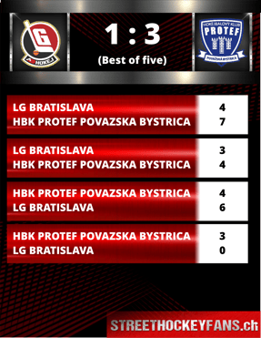 Bratislava nutzte den "Heimnachteil" des Gegners aus und verkürzte in der Serie, Spiel 4 und somit der Titel gingen dann aber mit einem 3:0-Sieg an Povazska Bystrica.