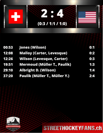 Abschlüssen entschlossener wirkten. So fand die Schweiz trotz aussichtsreichen Abschlusspositionen die Lücken bei US-Goalie Snyder nicht, und im Gegenzug stellten die USA innerhalb von 18