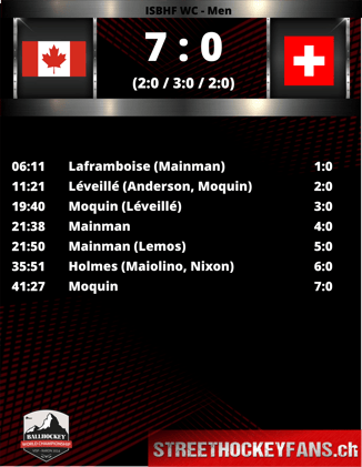 Eidgenossen in der Folge etwas fangen, gleichwohl gelangen Kanada im Schlussdrittel durch Holmes (36.) und Moquin (42.) zwei weitere Treffer zum Schlussstand von 0:7.