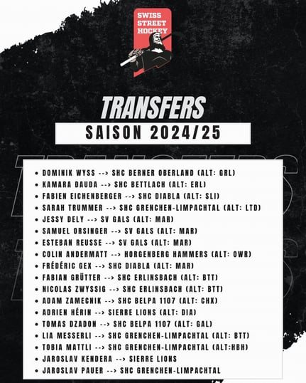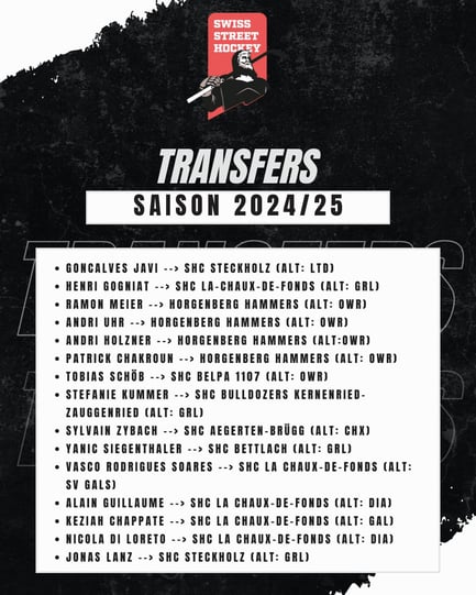 Swiss Streethockey hat die offiziellen Transfers der Saison 2024/2025 bekannt gegeben.