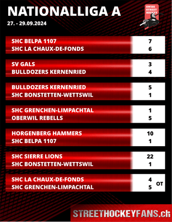 Es war ein vollgepacktes NLA-Wochenende, nicht weniger als 7 Partien wurden ausgetragen. Am Freitag Abend sahen die Zuschauer in Belp und Gals jeweils spannende Duelle. Der SHC Belpa 1107 lieferte sich mit dem SHC La Chaux-de-Fonds ein Offensivspektakel, bei welchem die Berner vor dem Schlussdrittel mit 7:5 führten. Den Gästen gelang zwar der Anschlusstreffer, trotz einem Schlussfeuerwerk jedoch nicht der Ausgleich. In Gals konnte Neuzugang Esteban Reuse zur Führung einnetzen, nach der ersten Pause antworteten die Gäste aus Kernenried aber mit 3 Treffern innerhalb von knapp 8 Minuten. Eine Doublette von Nicolas Wehrli glich die Partie wieder aus, doch Michel Bütikofer sorgte vor der Pause für die erneute Führung für die Bulldozers. Weil im Schlussabschnitt keine Treffer mehr fielen, schnappten sich die Kernenrieder die drei Punkte.