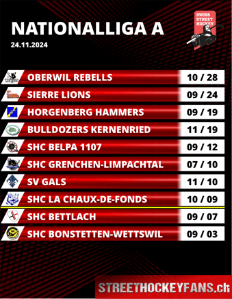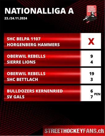 Die Oberwil Rebells gewinnen das Spitzenspiel gegen die Sierre Lions klar mit 9:4 und setzen sich an die Tabellenspitze. Gals siegt in Kernenried nach Penaltys.