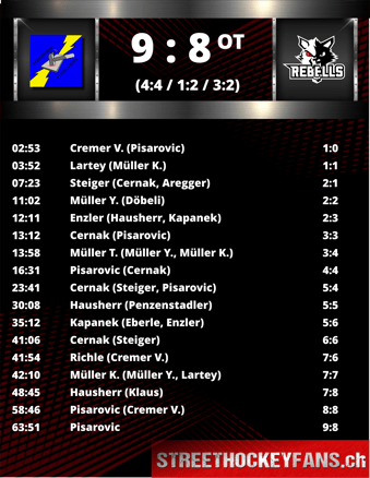 wieder wechselte. Wieder lagen die Rebells kurz vor Schluss in Führung, die Hammers versuchten mit einem zusätzlichen Feldspieler das Blatt zu wenden und tatsächlich gelang Pisarovic in der