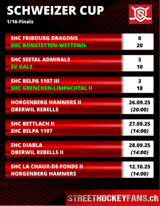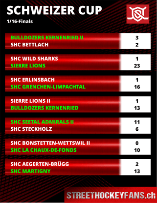 Drei weitere Partien der Sechzehntel-Finals stehen dann am übernächsten Wochenende noch auf dem Programm, das Duell zwischen La Chaux-de-Fonds II und den Horgenberg Hammers findet erst im Oktober